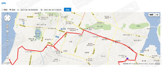 用戶可在平臺上通過在線電子地圖(Google Map、Baidu地圖等)總體瀏覽用戶所有設(shè)備的地理位置,查看某位置設(shè)備的詳細(xì)信息。在電子地圖上也可以通過縮放地圖,更加細(xì)致地瀏覽設(shè)備。用戶也可在平臺上直接查看GPS類型的傳感器數(shù)據(jù),將每個數(shù)據(jù)點(diǎn)用直線連接,繪制成一條運(yùn)動路徑。如下圖所示: