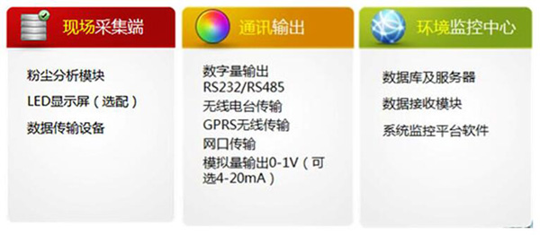 本系統(tǒng)以有線232傳輸方式為紐帶,組建現(xiàn)場端到監(jiān)控平臺的一個城域網(wǎng),實現(xiàn)各監(jiān)控點與監(jiān)控平臺的連接。現(xiàn)場端設(shè)備按照國家相關(guān)技術(shù)協(xié)議將實時粉塵監(jiān)測濃度指數(shù)傳輸?shù)奖O(jiān)控平臺,監(jiān)控平臺對監(jiān)控數(shù)據(jù)進行存儲、統(tǒng)計、分析、處理,為重點區(qū)域環(huán)境管理提供數(shù)據(jù)支持和決策依據(jù)。