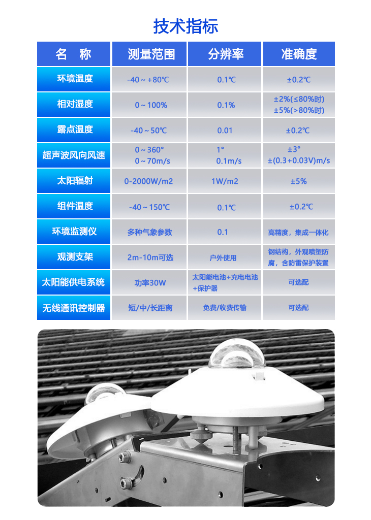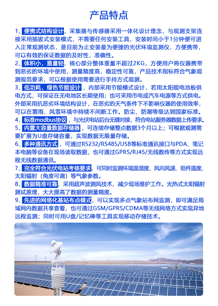 - 本產(chǎn)品是專業(yè)針對光伏發(fā)電站研發(fā)生產(chǎn)的一款最新型一體化光伏環(huán)境監(jiān)測儀,該設(shè)備采用新型一體化結(jié)構(gòu)設(shè)計,測量精度高,安裝使用方便,采用獨特的一體化超聲波微氣象儀,集溫濕度、風(fēng)速、風(fēng)向、壓力、背板溫度集成于一體。具有高精度,高穩(wěn)定性,是目前最適合光伏發(fā)電站上使用的領(lǐng)先級的一體化光伏環(huán)境監(jiān)測儀。