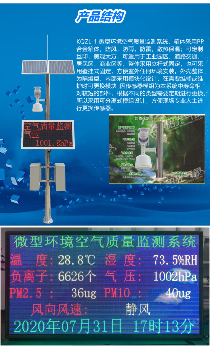 - KQZL-1 微型環(huán)境空氣質(zhì)量監(jiān)測系統(tǒng),箱體采用PP合金箱體,防風(fēng),防雨,防雷,散熱保溫;可定制絲印,美觀大方,可適用于工業(yè)園區(qū)、道路交通,居民區(qū),商業(yè)區(qū)等。整體采用立桿式固定,也可采用壁掛式固定,方便室外任何環(huán)境安裝。外殼整體為隔爆型,內(nèi)部采用模塊化設(shè)計,在需要維修或維護時可更換模塊 ;因傳感器模組為本系統(tǒng)中壽命相對較短的部件,根據(jù)不同