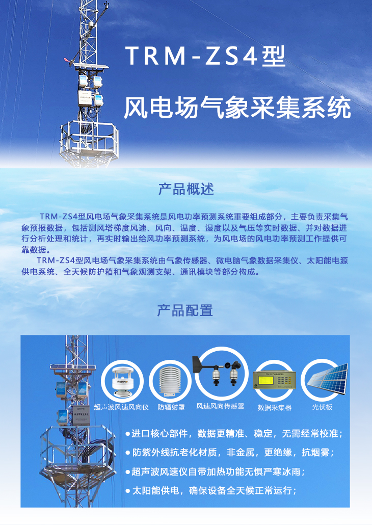 - TRM-ZS4型風(fēng)電場氣象采集系統(tǒng)是風(fēng)電功率預(yù)測系統(tǒng)重要組成部分,主要負(fù)責(zé)采集氣象預(yù)報數(shù)據(jù),包括測風(fēng)塔梯度風(fēng)速、風(fēng)向、溫度、濕度以及氣壓等實(shí)時數(shù)據(jù)、并對數(shù)據(jù)進(jìn)行分析處理和統(tǒng)計,再實(shí)時輸出給風(fēng)功率預(yù)測系統(tǒng),為風(fēng)電場的風(fēng)電功率預(yù)測工作提供可靠數(shù)據(jù)。