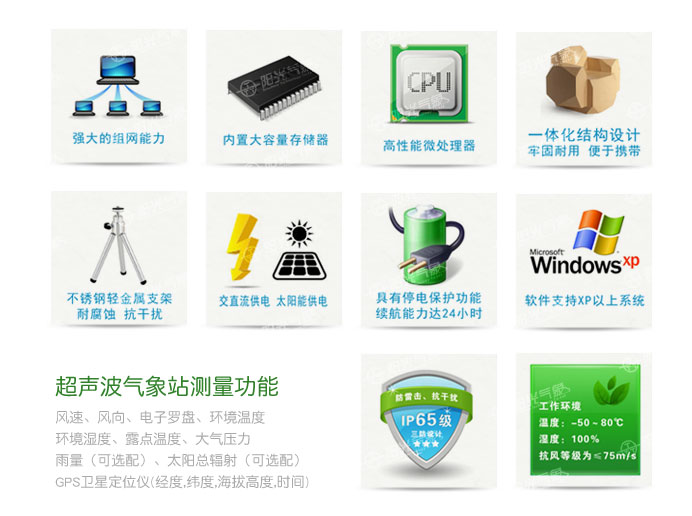 - 該氣象站采用超聲波探頭來測量風(fēng)速和風(fēng)向,沒有任何移動部件,儀器結(jié)構(gòu)緊湊,更加耐用,數(shù)據(jù)更加可靠。也可用內(nèi)置的溫度、濕度和氣壓傳感器等傳感器探頭監(jiān)測相關(guān)氣候指標(biāo)。精確的測量數(shù)據(jù)可以幫助氣象、軍事、水利、交通及科研等組織提供精確的數(shù)據(jù)依據(jù)及判斷條件。