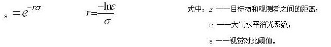 能見(jiàn)度是與人的視覺(jué)因素緊密結(jié)合在一起的一種復(fù)雜的心理-物理現(xiàn)象,表示的是可視距離。根據(jù)柯西密德(Koschmieder)定律,對(duì)以水平天空為背景的黑體目標(biāo)物,目標(biāo)物和背景視亮度對(duì)比可以表示為:
